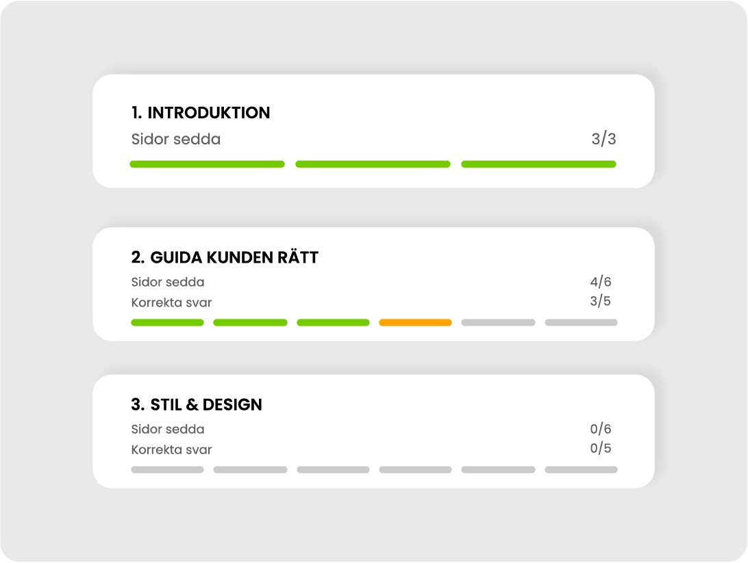 Med Moblrn ges tillgång till omfattande statistik och insikter om vad användarna kan och inte kan, på ett enkelt och överskådligt sätt. Identifiera målgruppens styrkor och kunskapsglapp - och skräddarsy därefter insatser för att möta de specifika behoven.