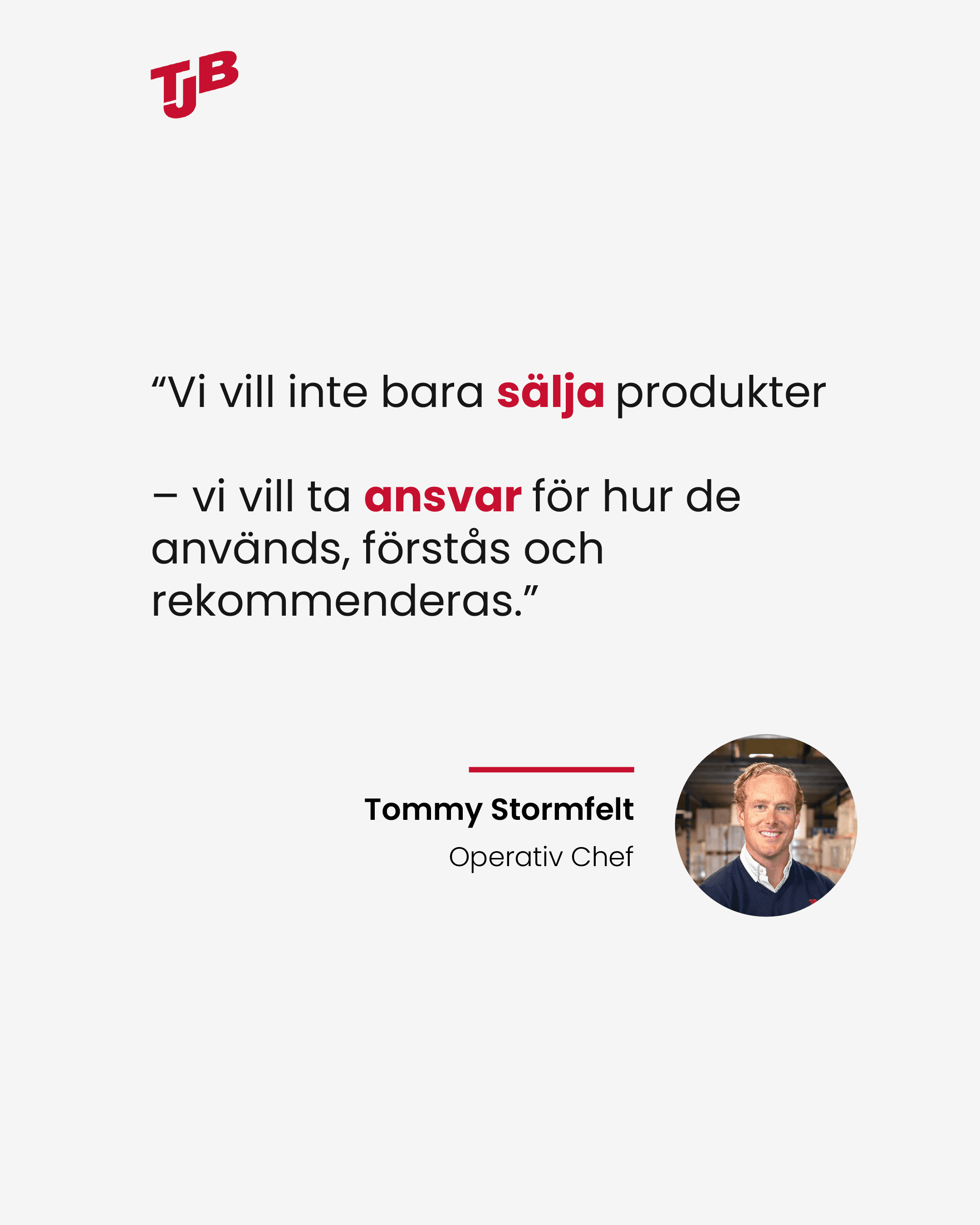 Att vara den kompetenta takpartnern innebär för TJB att bidra med vägledning, erfarenhet och kunskap i varje led. Målet är att göra det enkelt att välja rätt lösning, oavsett om mottagaren är butikssäljare, takläggare eller beställare. Genom att minska risken för fel och felanvändning skapas trygghet och mer hållbara taklösningar över tid.