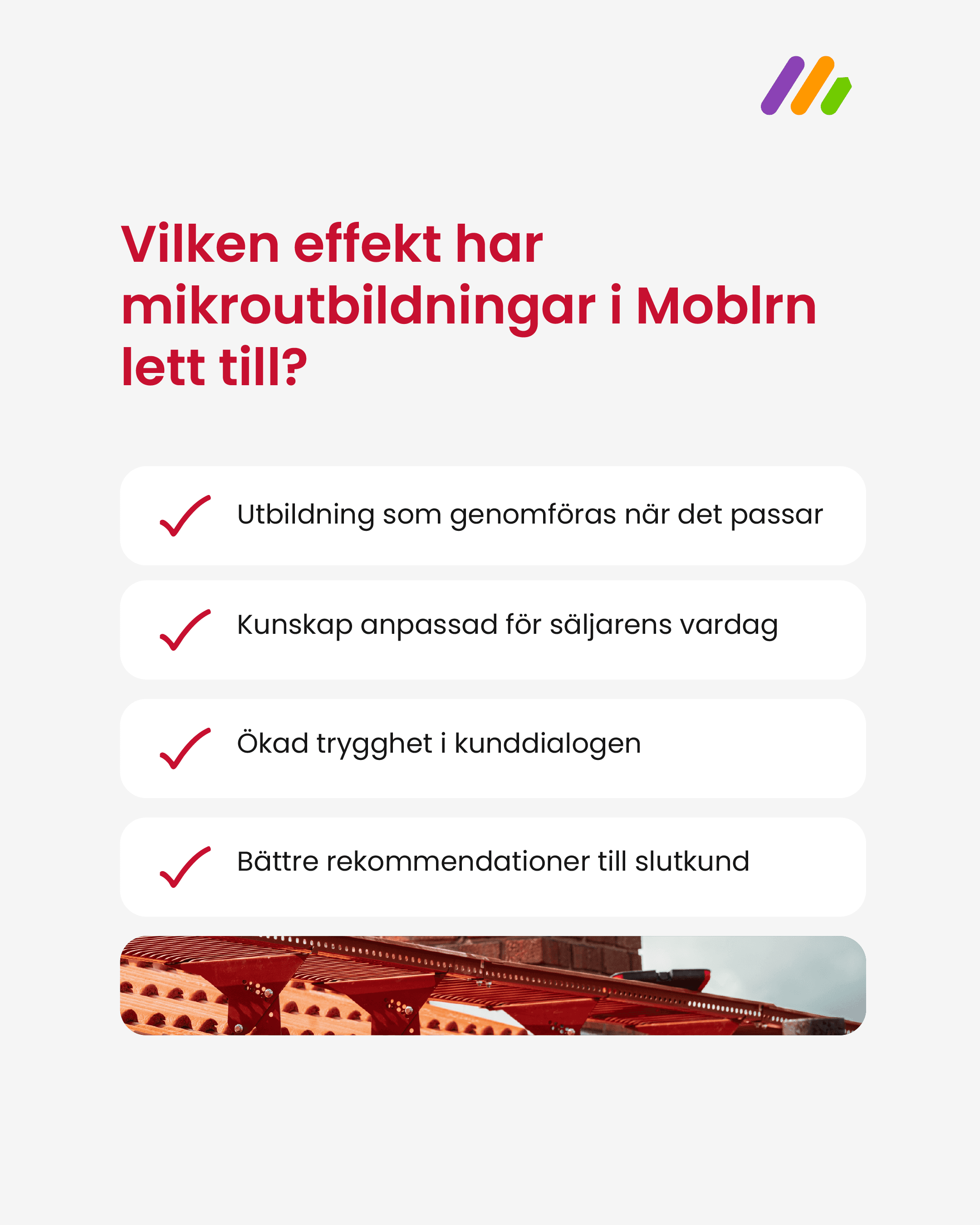 Att vara fysiskt på plats hos alla bygghandlare och takläggare är inte alltid möjligt. Samtidigt förändras både sortiment och regelverk kontinuerligt. Digital utbildning via Moblrn blev därför ett naturligt steg för TJB. Mikroutbildningarna är ett sätt att göra kunskap tillgänglig i rätt tid och på lika villkor, oavsett var kunden befinner sig.