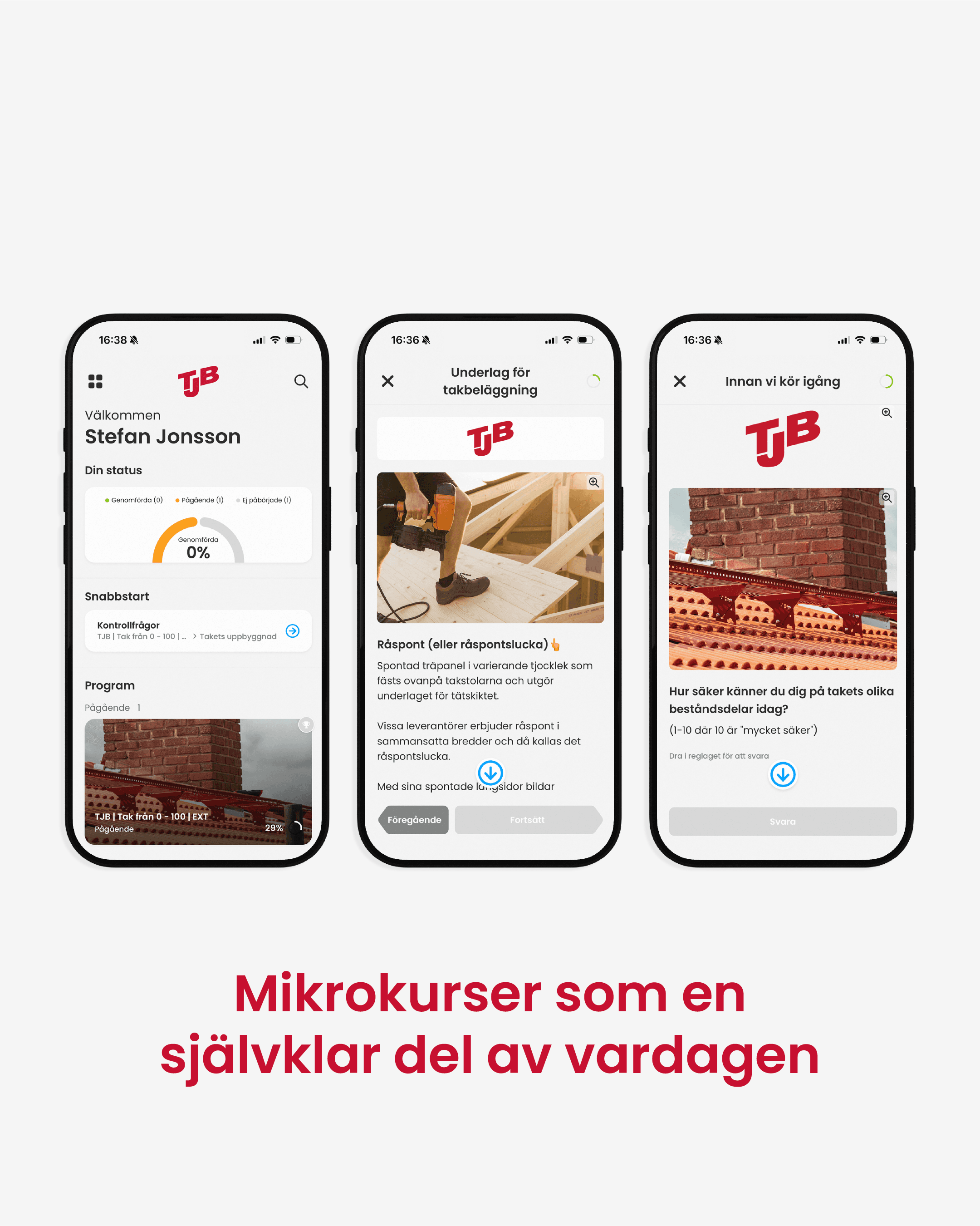 Med mikrokurser gör TJB det enkelt för kunderna att snabbt få den kunskap som krävs för att kunna rekommendera rätt lösningar till rätt kunder. Korta och lättillgängliga utbildningar säkerställer att kunskapen finns där i rätt ögonblick, vilket stärker rådgivningen och bidrar till genomtänkta och korrekta val inom tak. Mobrlrn stöd för TJB:s kunder och ett viktigt steg i att fortsätta vara det självklara valet och den kompetenta affärspartnern inom tak.
